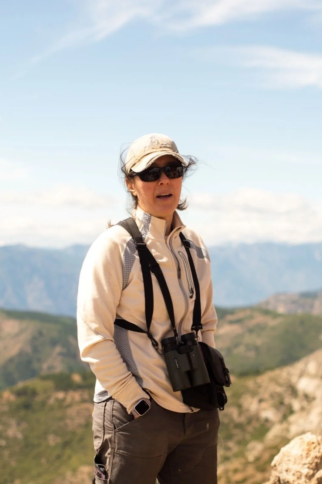 Spread out among the rocky outcrop at the observation point, Jessica, Skyler and Janet share their wealth of knowledge with us. The exclamation “BIRD!” is a common and acceptable interruption of the conversation. Eager eyes immediately scan the sky as fingers point and everyone shouts out their guesses of the flying raptor’s identification. Clearly in her element, Janet Millard stands on the edge of the rocks wearing her tattered “bird nerd” hat with binoculars around her neck.