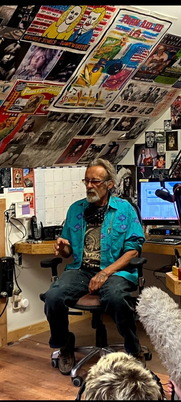 Tucked into the upper story of a building in downtown Twisp, WA, Don Ashford broadcasts KTRT “The Root” to the Methow Valley. We managed to cram all twenty-four of us into the slanted-ceiling studio where Don spends his time on radio. He has created his own wallpaper of music posters, maps, and other paraphernalia. At the center point of the room sits Don, wearing a shirt that says, “Nature is my religion, and the earth is my church”, and the backs of his hands are tattooed with bear paws. He walks us through his ethics on playing music to match the time of day, moving from high energy songs while at work to slower tempos before dinner. Don has been officially managing The Root since 2008. Before he moved to the TwispWorks campus, he ran the radio from a barn behind his house in Mazama. Don left us enchanted by the passion he exudes towards music, connecting communities, and intention. For the remainder of our time in the Methow Valley, 97.5 “The Root” streamed through our car speakers as we drove to talk with other locals. Nat, a student, asked every guest if they listened to the station and was repeatedly met with “of course! Don is awesome!” or something similar. Although we inevitably left the radio range of “The Root”, Don’s influence has stayed with us, his name continually coming up in conversation.